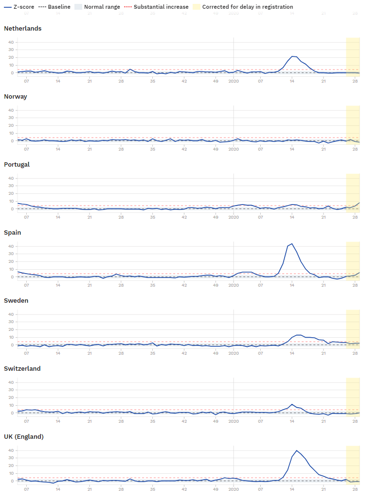 So what is the best metric to look at? The best metric to look at is called excess mortality. Simplified, excess mortality means how many more people of different age groups died during 2020 compare with the past few years? This “added deaths” are to a large degree due to the coronavirus pandemic. Not all of them will be, as there are always year-to-year variation in deaths. There is also a risk of underestimating deaths as deaths due to e. g. seasonal influenza has also gone down due to social distancing. But it is the best metric available.
